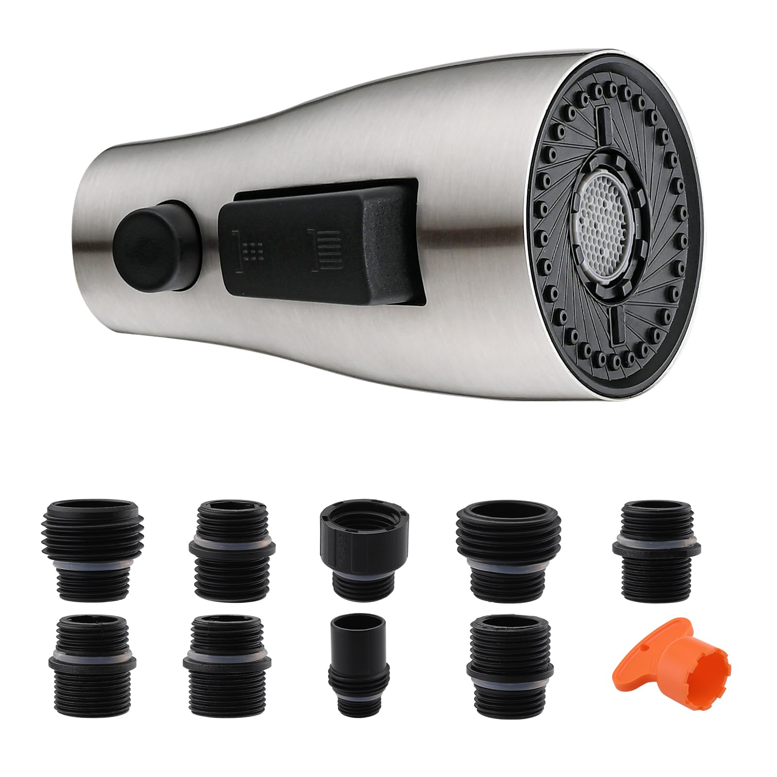 Dlymtrx Kitchen Faucet Head Replacement With 9 Adapters, 3-Function Spray Nozzle, Pull-Down Sink Sprayer Compatible With Delta, Kohler, Moen Faucets, Brushed Nickel