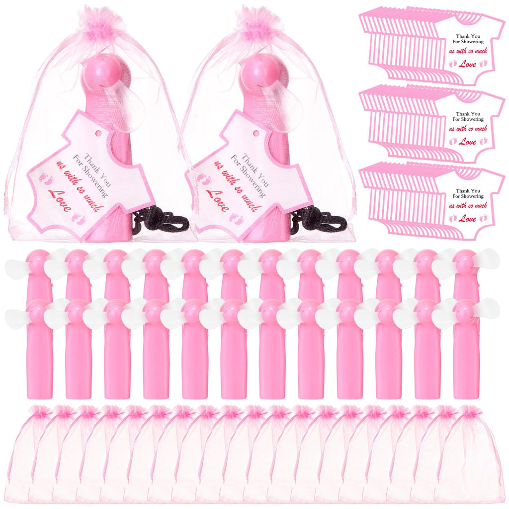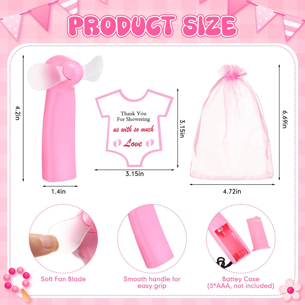 Quality Material: the mini handheld fans are made of quality plastic materials, lightweight and portable, sturdy and reliable, not easy to break or tear, which makes them ideal for decoration and practical use Portable Size: each small hand fan measures about 4.72in x 2.24in x 1.26in, the baby shower favor card is about 3.15in x 3.15in, and the organza bag is about 5.12 x 7.09 in, proper size for you to use and carry