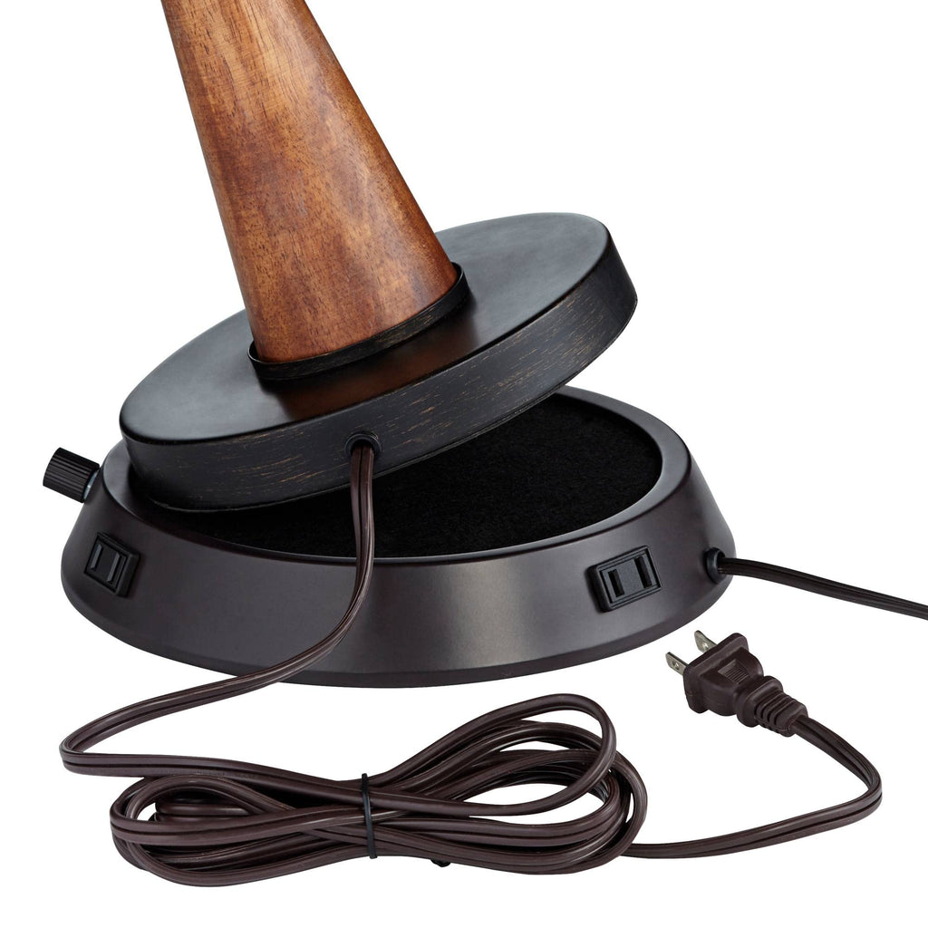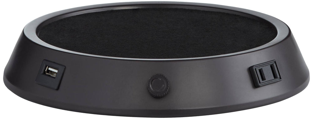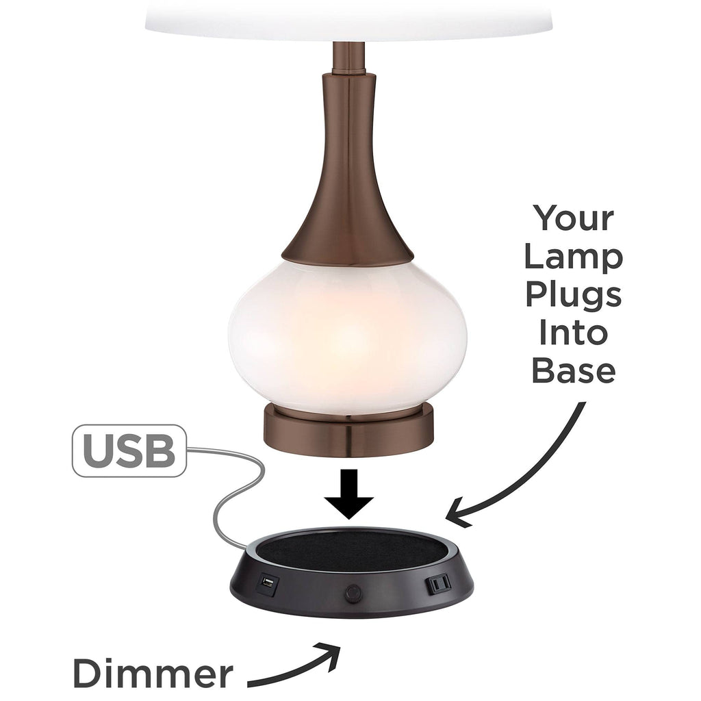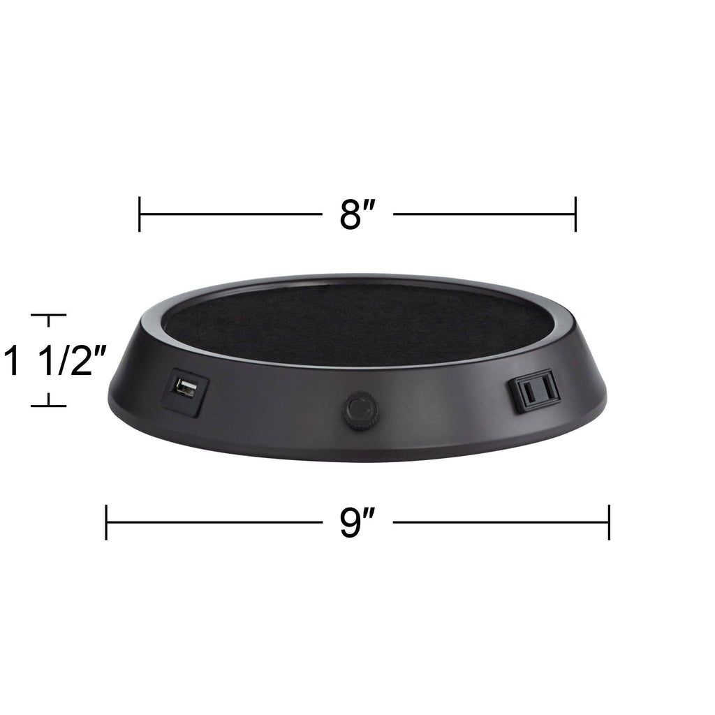 Base has a built-in USB port along with 2 two-prong outlets. USB rated at 2 amps. Full-range dimmer switch works with any dimmable bulb. Comes with a 5 1/2" wide neoprene no-skid pad that can be used under your lamp