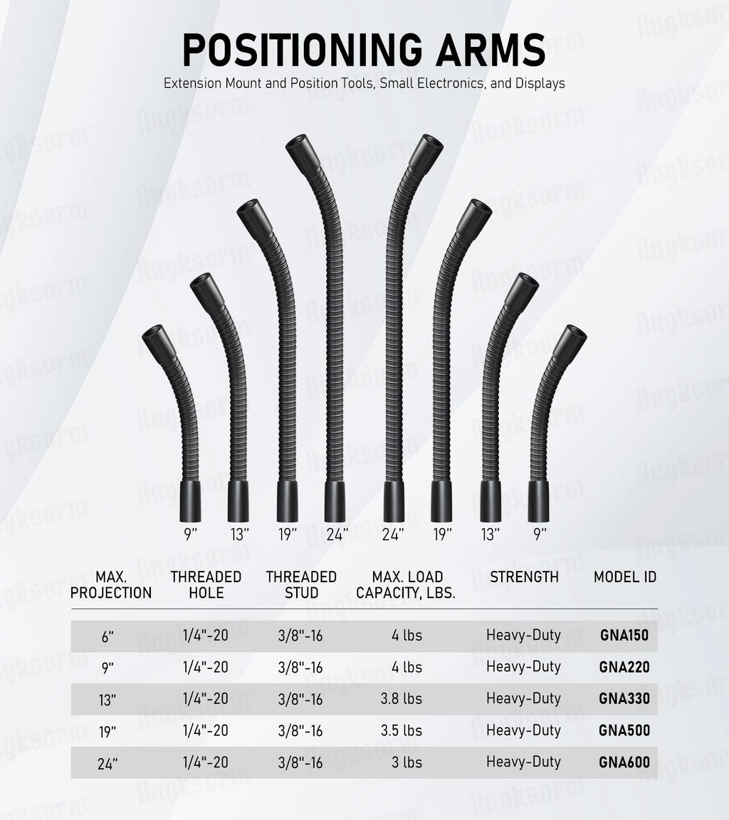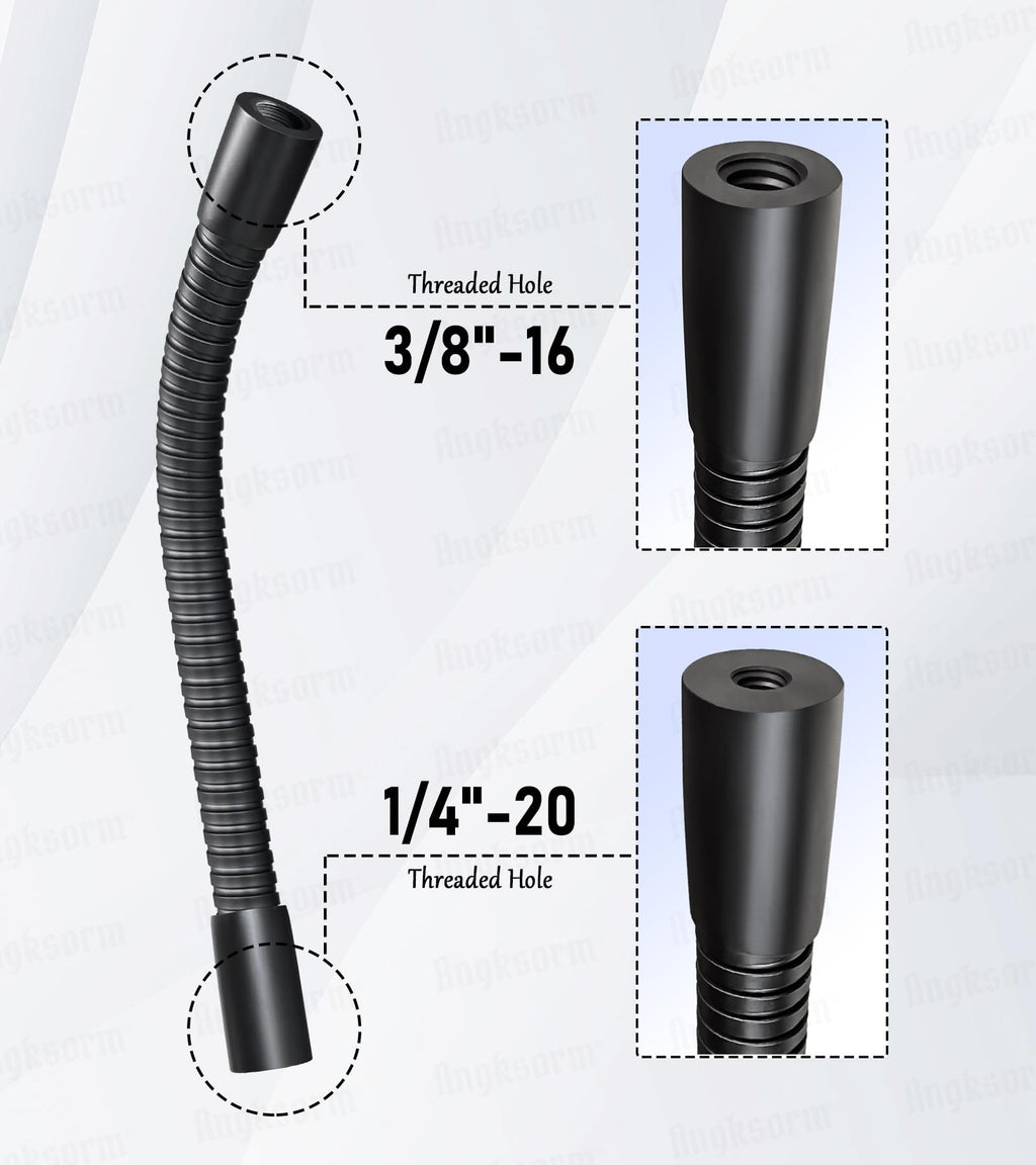 The Angksorm Heavy-Duty flexible gooseneck tubing is a versatile mounting solution that can hold a variety of photographic equipment, including video lights, flashes, reflectors, monitors, microphones, and more. It's also compatible with mirrorless and compact DSLR cameras, point-and-shoots, camcorders, action cameras, G0Pr0 cams, smartphones, and tablets. This adjustable heavy-duty flexible gooseneck arm mount is perfect for applications where flexibility is needed. With a length of 9 13 19 24 inches, 15mm diameter, and supporting up to 3 pounds, you can flex the arm in a variety of angles to position your camera or photographic equipment. It can also be twisted into numerous configurations that wouldn't be possible with a jointed articulating arm.