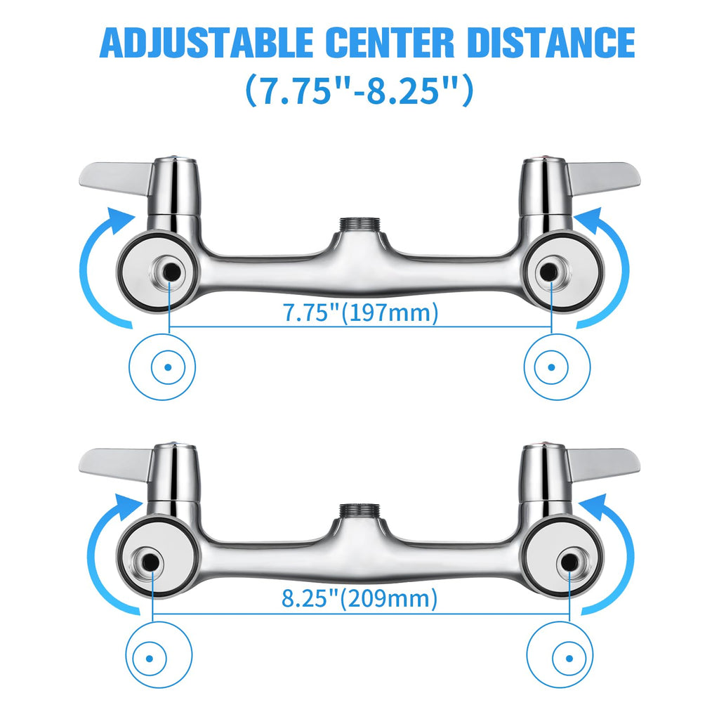 • 8 Inch Adjustable Center - This Commercial Kitchen faucet mounts to the wall using a pair of G1/2" female inlets. Those inlets can adjust from 7 3/4" to 8 1/4". Allowing you to fit them directly onto your facility's water lines with ease. Suitable for 1, 2 or 3 compartment professional grade commercial kitchen sink use