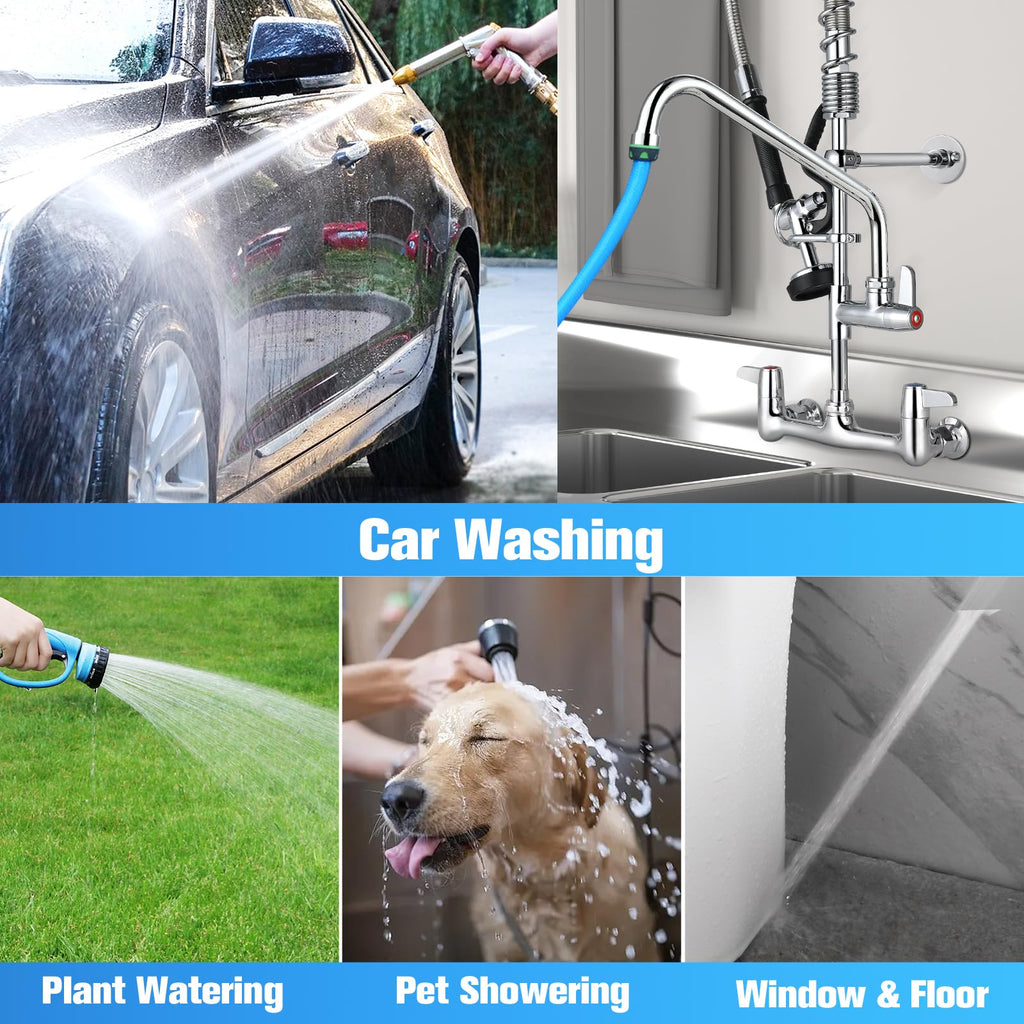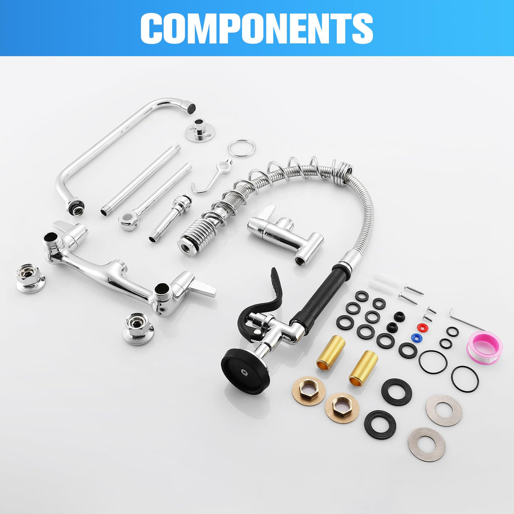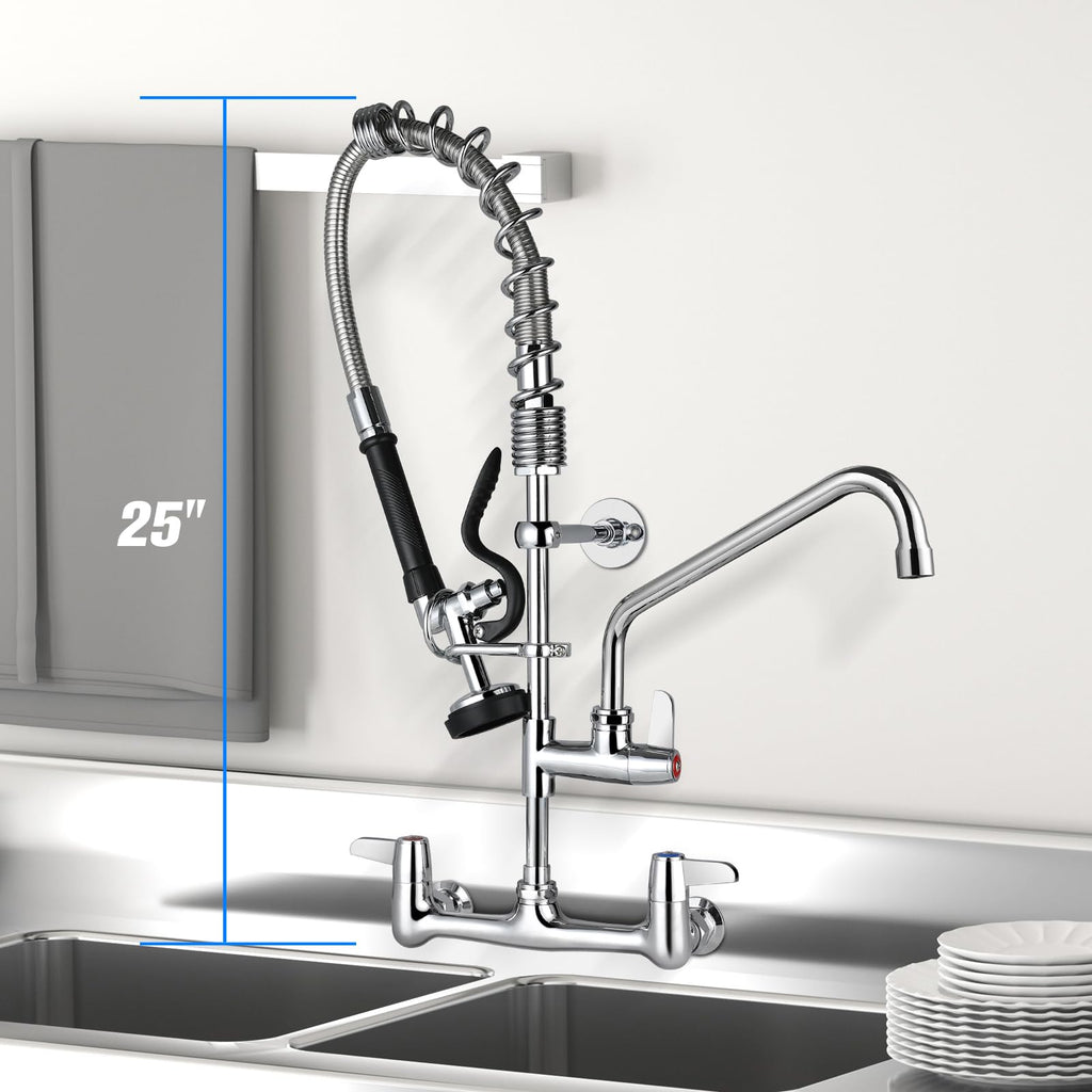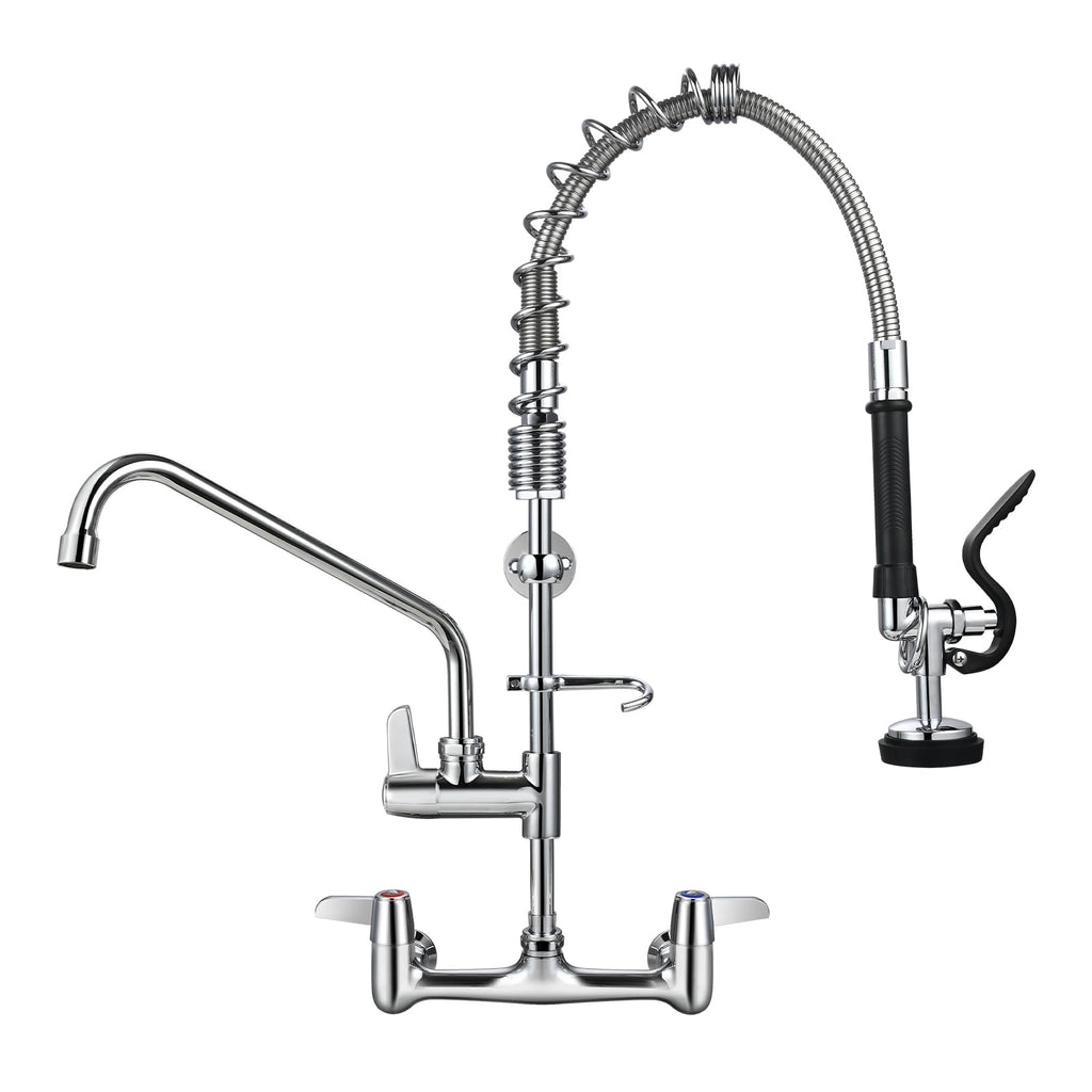 Commercial Sink Faucet - This wall-mounted pre-rinse faucet with sprayer and add-on faucet ultra-high pressure (1.42GPM) is perfect for cleaning excess food and sauces from plates. You can use all its functions with one hand. Wash your kitchen utensils very efficiently. Save your working time