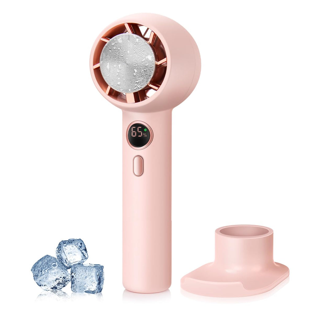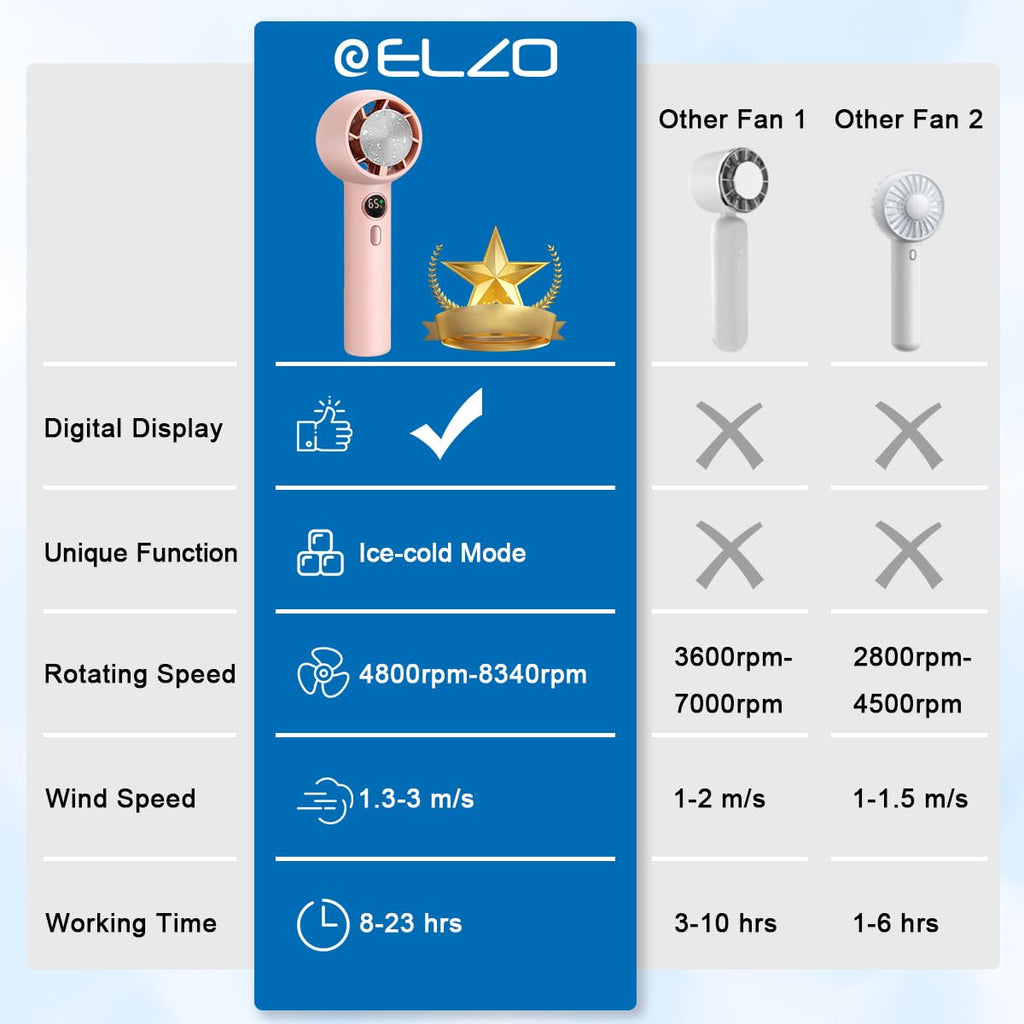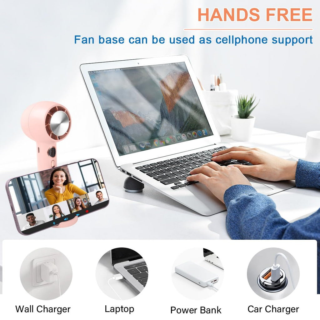 Cold Air with Cooling Mode ELZO Portable Turbo Fan is equipped with a cooling aluminum alloy piece, which can achieve local rapid cooling for the skin under close contact. Please press the power button longer to start/stop the cooling mode (green snowflake symbol appears/disappears). Hands-Free & Cellphone Stand Support Equipped with a detachable base, the small hand fan can be stably placed on the desktop. You can also use it as a phone holder to watch videos while blowing the cool breeze.