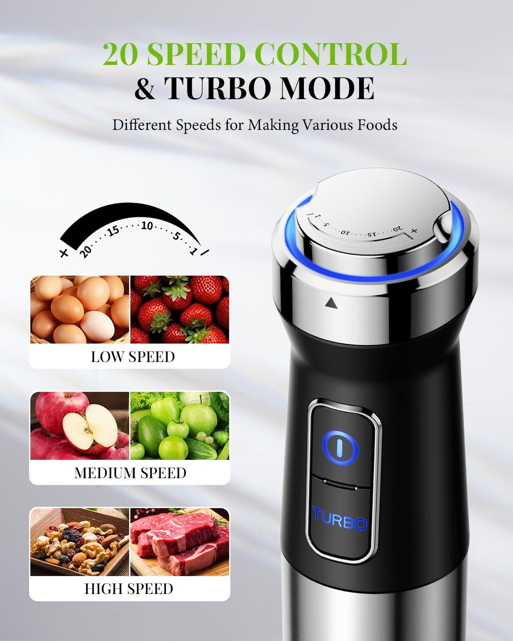 • 20-Speed Control & Turbo Mode - Designed With A 20-Speed Control Dial And A Turbo Button. You Can Adjust The Speed From Low To High By Rotating The Dial On The Top Of The Blender, Depending On Your Ingredients And Preferences. When You Need That Extra Burst Of Power, Simply Hold Down The Turbo Button.