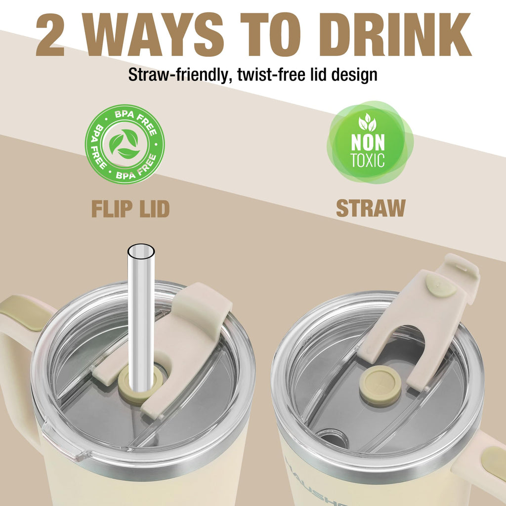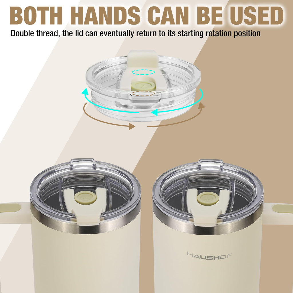Double-threaded for Both Hands: The double thread of the travel mug's mouth allows the mug to finally screw back to the position where the lid began to screw. You can determine the position of the drinking hole at the beginning according to the use need of a right hand or left hand, then the drinking hole will fall on the position where you set after the screw Pay Attention to Every Detail: HAUSHOF 40 oz tumbler with handle and straw, which provide maximum convenience in use, you can drink through the direct drinking hole or you can drink it through a straw. The silicone straw mouth on the lid has excellent elasticity so that the straw won't shake casually after insertion. The ergonomic PP handle feels comfortable to hold and is perfect for people who need to drink water frequently, handle can take less effort to use
