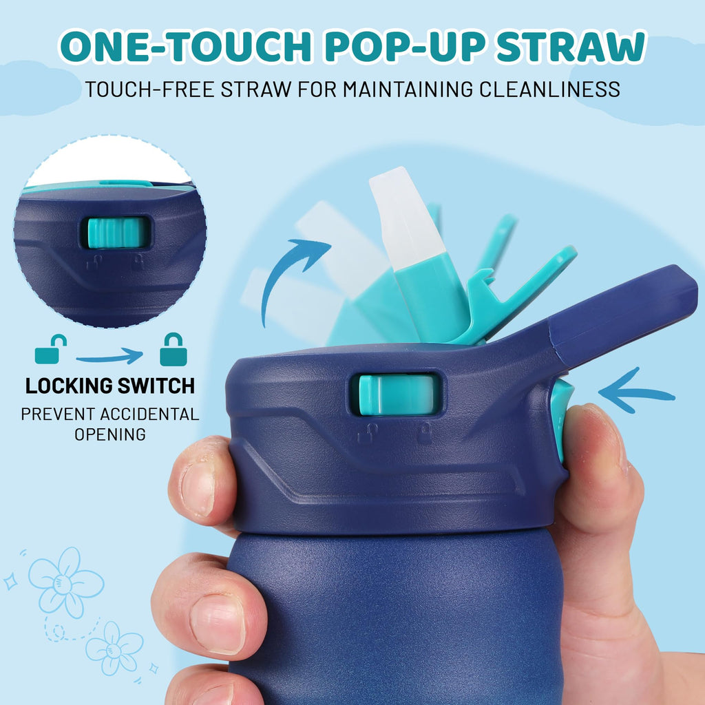 Child-Safe Premium Materials: Featuring BPA-free and non-toxic bottle caps and straws, our product ensures safety for children. Equipped with an ample sealing ring, it s 100% leak-proof performance. Additionally, boasting a double-layer vacuum insulation design, it keeps hot drinks warm for up to 6 hours and cold drinks chilled for up to 18 hours One-Touch Pop-Up Design: The HAUSHOF 12 oz kids' water bottle features a one-touch pop-up design, allowing children to effortlessly drink water with just a press of the push button. No need to touch the straw, making it safer for kids to use. Equipped with a locking switch, worry-free backpack carrying enables children to be themselves