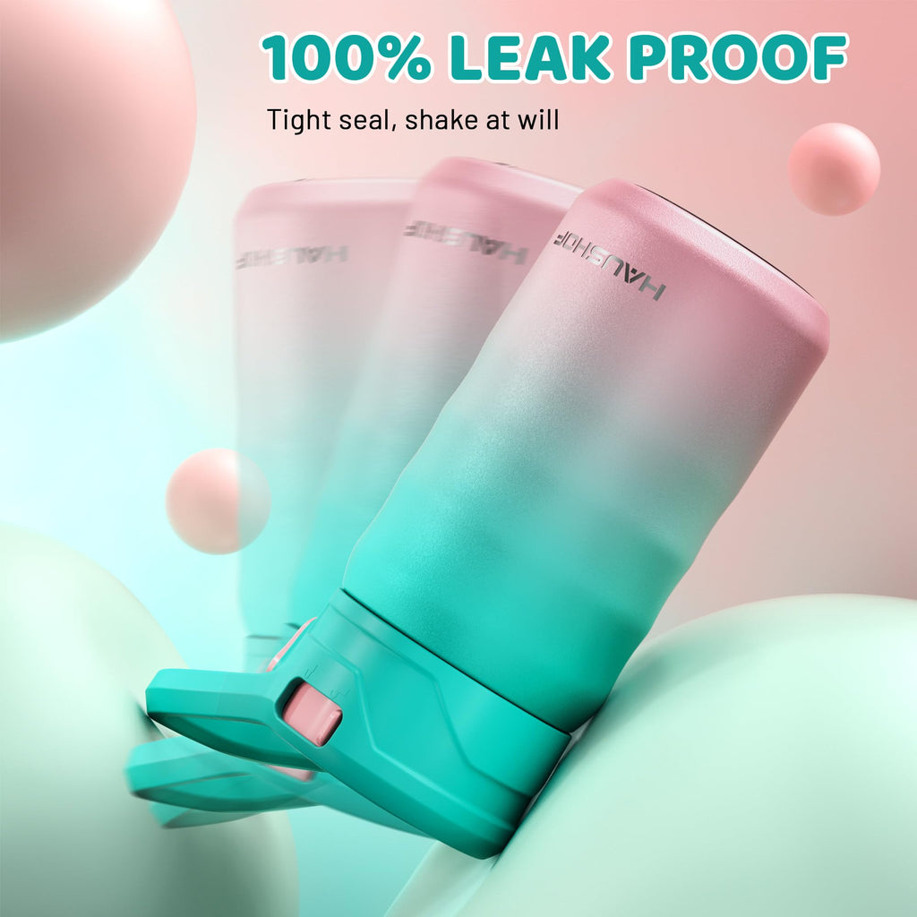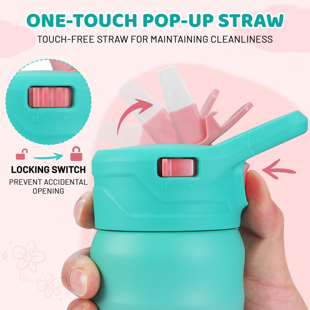 Child-Safe Premium Materials: Featuring BPA-free and non-toxic bottle caps and straws, our product ensures safety for children. Equipped with an ample sealing ring, it s 100% leak-proof performance. Additionally, boasting a double-layer vacuum insulation design, it keeps hot drinks warm for up to 6 hours and cold drinks chilled for up to 18 hours. One-Touch Pop-Up Design: The HAUSHOF 12 oz kids' water bottle features a one-touch pop-up design, allowing children to effortlessly drink water with just a press of the push button. No need to touch the straw, making it safer for kids to use. Equipped with a locking switch, worry-free backpack carrying enables children to be themselves.