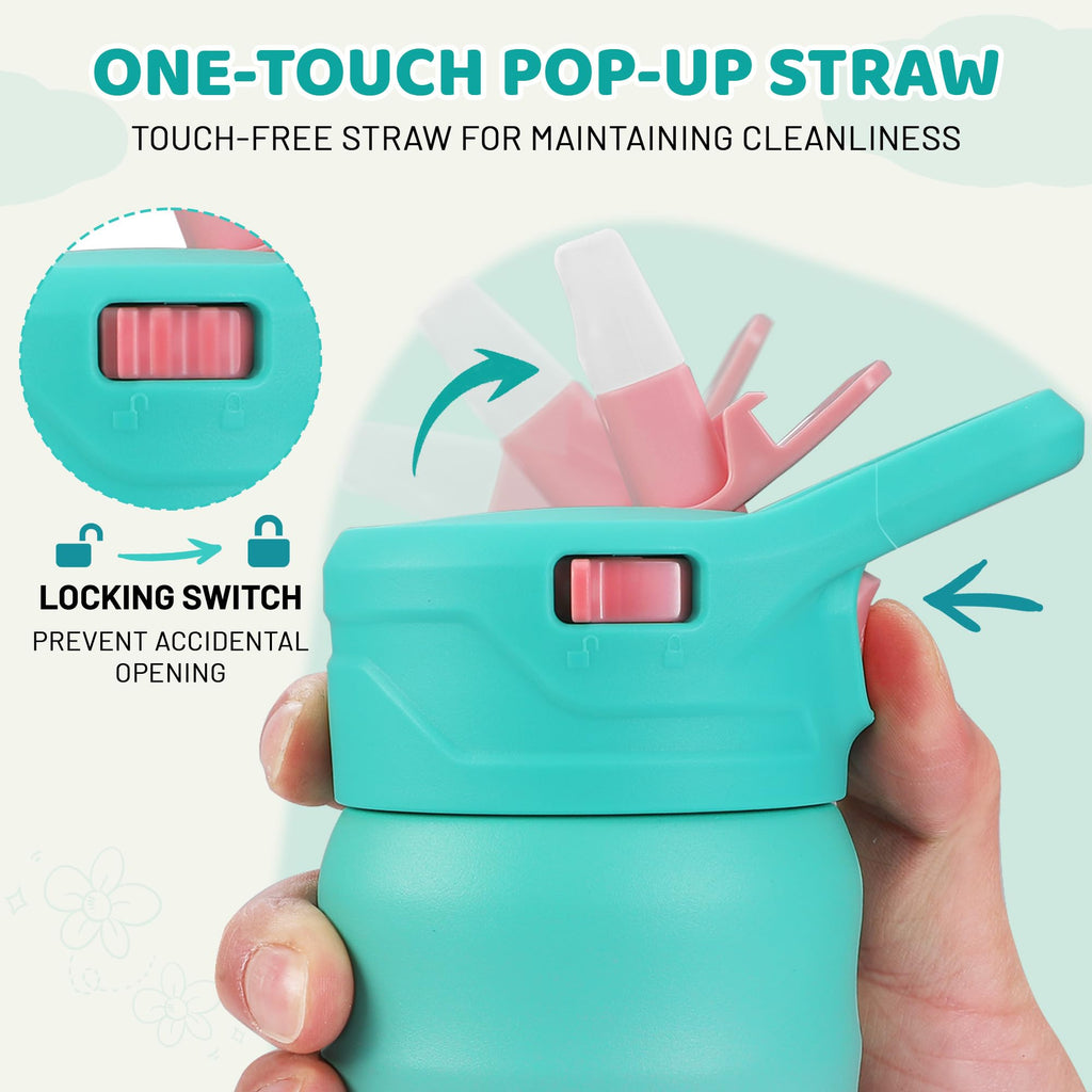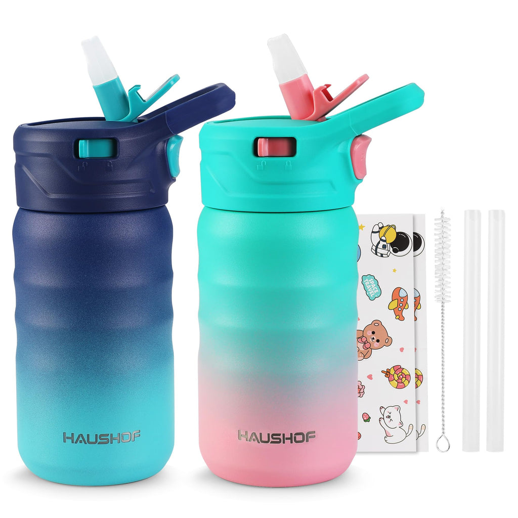 Child-Safe Premium Materials: Featuring BPA-free and non-toxic bottle caps and straws, our product ensures safety for children. Equipped with an ample sealing ring, it s 100% leak-proof performance. Additionally, boasting a double-layer vacuum insulation design, it keeps hot drinks warm for up to 6 hours and cold drinks chilled for up to 18 hours One-Touch Pop-Up Design: The HAUSHOF 12 oz kids' water bottle features a one-touch pop-up design, allowing children to effortlessly drink water with just a press of the push button. No need to touch the straw, making it safer for kids to use. Equipped with a locking switch, worry-free backpack carrying enables children to be themselves
