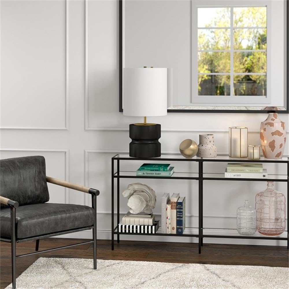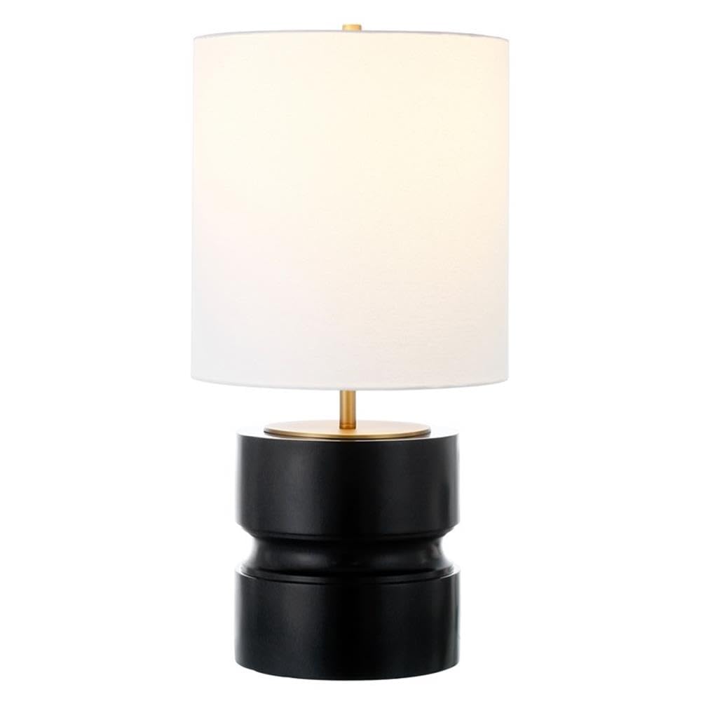 Handcrafted matte black and brass finish is applied to the round metal base. Paired with a white drum linen shade.