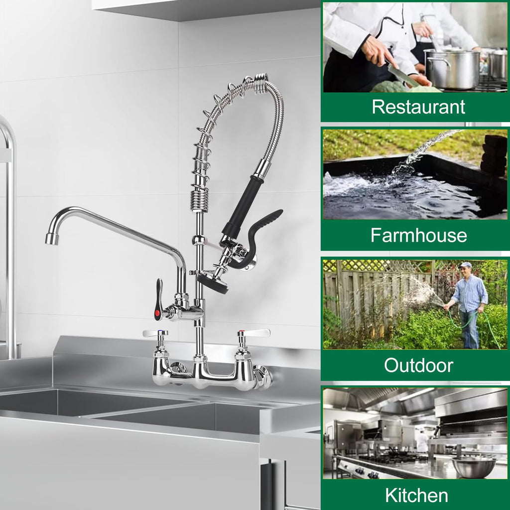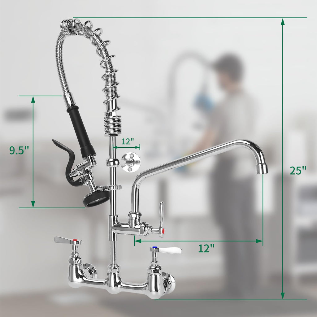 Commercial Sink Faucet with 12 inch spout KWODE commercial faucet is made of our factory directly. Before we just sold 21” 27” 35” 43” 47”commercial faucet, but most customer ask that this is more height for home kitchen. So we just check and give new height commercial faucet-25” height, just sold by most customer purchasing and using at home kitchens. Commercial Faucet with Sprayer Specification: Item Name: Commercial Sink Faucet Installation method: Wall Mounted/ backsplash mount Faucet height:25 Inch(after installation) Swivel Spout: 12 Inch Spray Hose:18 Inch/46cm Center Distance: 7.75 to 8.25 Inches Sprayer Material: Stainless steel & Brass& POM Material: Brass Construction Polished Chrome Water Supply: Both Hot& Cold water supply How to adjust the hole center Wall mounted faucet using a pair of G 1/2”female inlets with 2” flanges.Those inlets can adjust from 7.75”to 8.25”, allowing you to fit them directly onto your facility’s water lines with ease. How to get spare parts We have sold all the spare parts separated, please search”KWODE” to find it. Liking the 90°angle installation kit, 6,8,10,12,14 swivel spout, 38 inch or 44 inch hose, different color spray valve etc. Widely Application: This 25 inch commercial faucet with pre-rinse sprayer is widely used at home or small restaurant or industrial kitchen compartment sinks Package List: 1 Spray Valve 1 Bent Pipe 1 Ring 1 Finger Hook 1 Riser Pipe 1 Wall Bracket 1 Lever Handle 1 Swing Nozzle 1 Add-on Faucet 1 "3" Tube 1 Spare Parts Attention: The add-on swing spout is 12" Length, if you need much shorter or longer spout, get it for a significant discount - refer to our Specials and Promotions for more details. When you install the faucet, do not lose the rubber seal, you should confirm you have already used the rubber seal before you connected each pipe to protect from leakage.