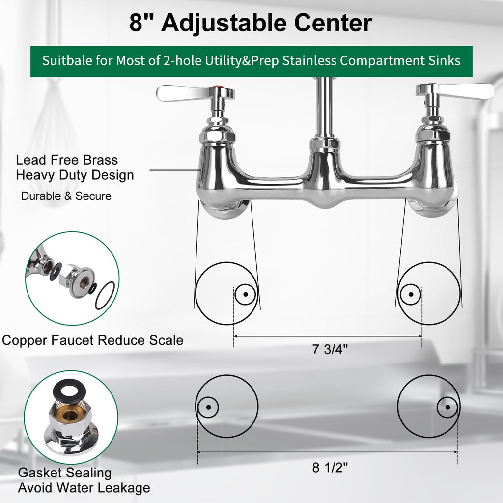 • 8 Inch Adjustable Center 2-Hole Wall Mount Faucet- This faucet mounts to the wall using a pair of G1/2" female inlets. Those inlets can adjust from 7 3/4" to 8 1/4".Total height is 25 inches from wall mount flange to the top. And add on faucet can reach 12" from wall. Suitable for 1, 2, or 3 compartment professional grade commercial kitchen sink use.