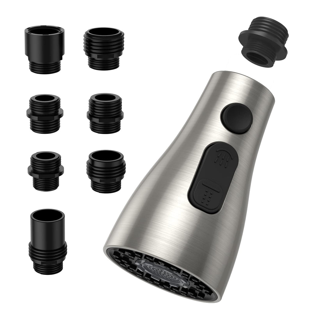 7 Types Adapters for Kitchen faucet Hose: Pull down spray head comes with 7 adapters for various connections that is compatible with major brand faucet hoses. You can choose this with the correct size High Quality: Kitchen faucet head is made of engineering grade plastic (PC/ABS) with ergonomic design. brushed nickel finished that resists scratches, ensures longevity, and withstands rust effectively.