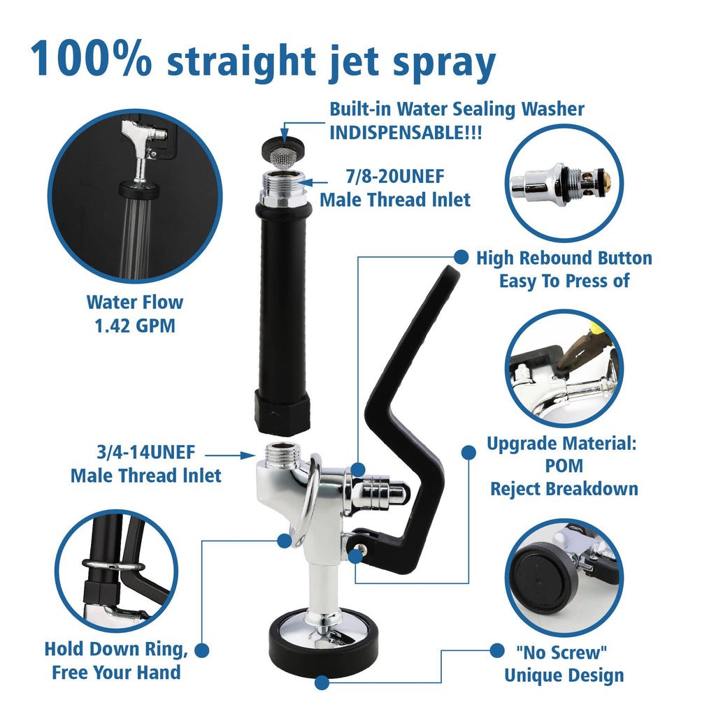 • Pre-rinse Faucet Easy Installation:Built-in water sealing washer, no need to apply PTFE tape.“Pop-and-Lock” riser connection,easy to install the faucet by hand.Repair Kit ( spare washers and screws) Included.Please make sure all washers inside the tube before installation.
