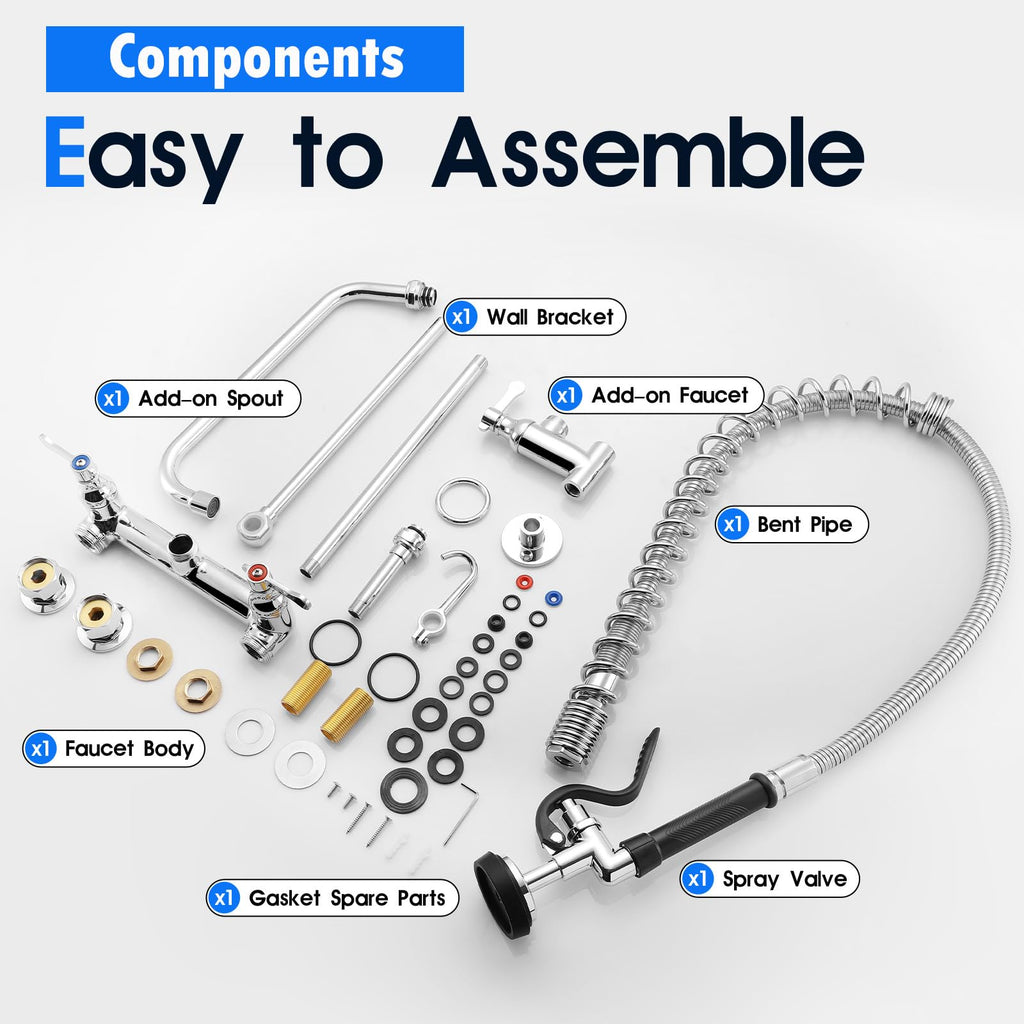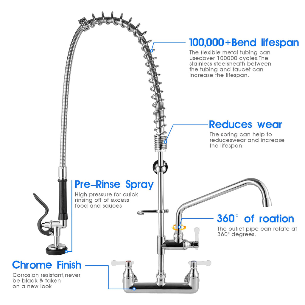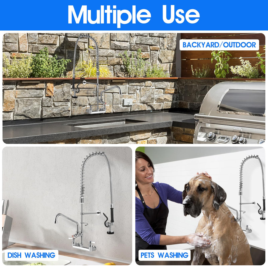 8 Inch Adjustable Center --- This commercial faucet mounts to the wall using a pair of G1/2 female inlets. Those inlets can adjust from 7 3/4" to 8 1/4", allowing you to fit them directly onto your facility's water lines with ease --- The total height extends to 36 inches from the wall mount flange to the top, while the additional faucet can reach 12 inches from the wall. Suitable for 1, 2 or 3 Compartment Professional Grade Commercial Kitchen sink use Heavy Duty Commercial Pre-Rinse Faucet --- OIERZIN commercial faucet is made of solid brass and superior metal, weighs 12 pounds. The multilayer chrome resists rust, provides a shiny look. No rust, no cracks, no corrosion, ensuring it's engineered for many trouble-free years in a restaurant kitchen