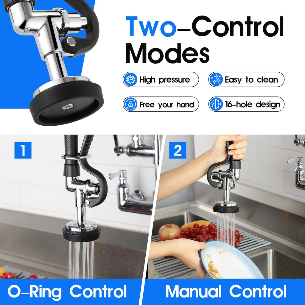 • 12" Swivel Spout and 1.42GPM Pre Rinse Sprayer --- This commercial kitchen faucet faucet comes 38” flexible stainless hose with spray nozzle and 12" swivel spout. It can be 360°rotation to clean every corner of the sink. The convenient compression ring allows one-handed operation during busy hours, leaving your other hand free. 2 handle hot and cold water control easy to use and change the water