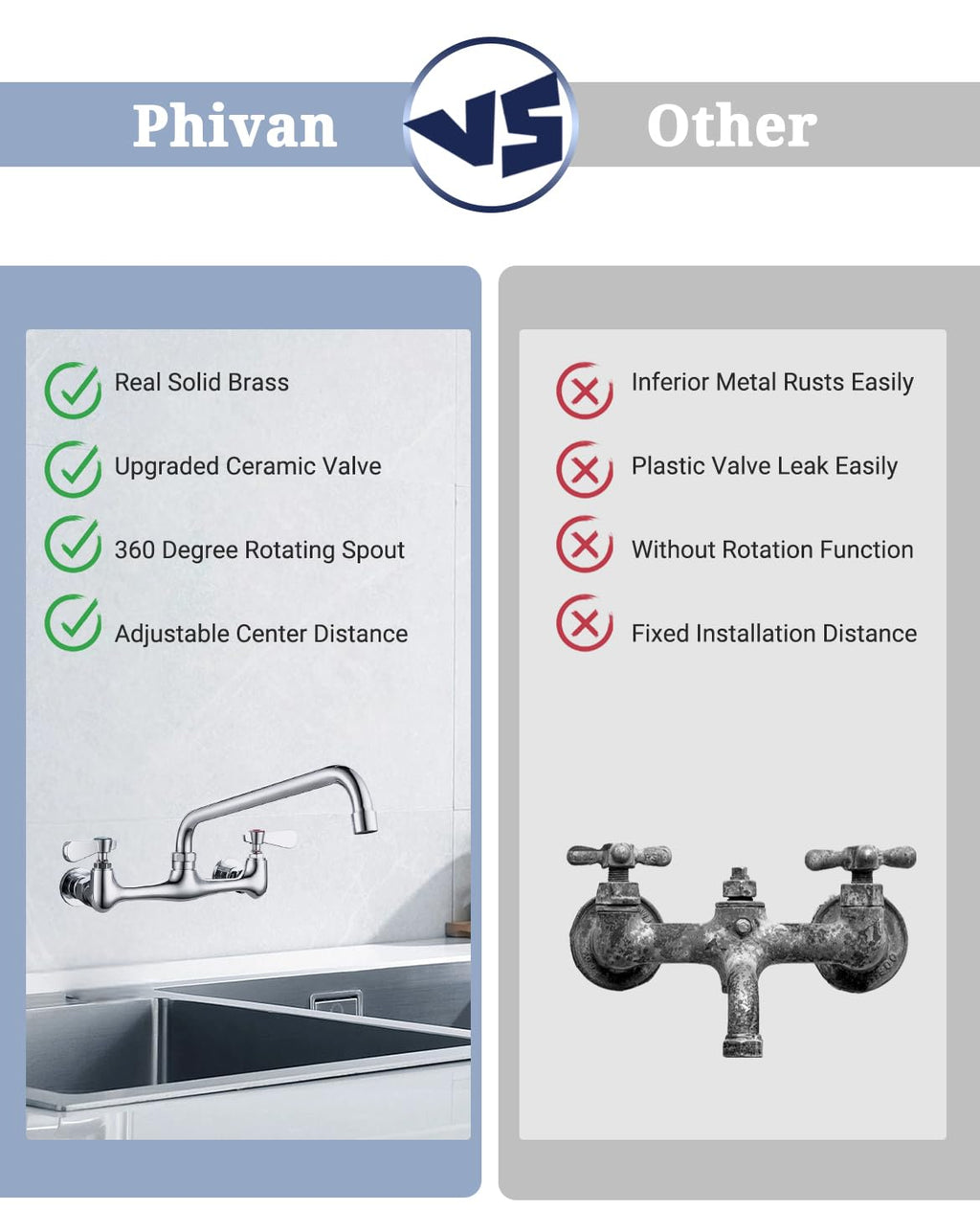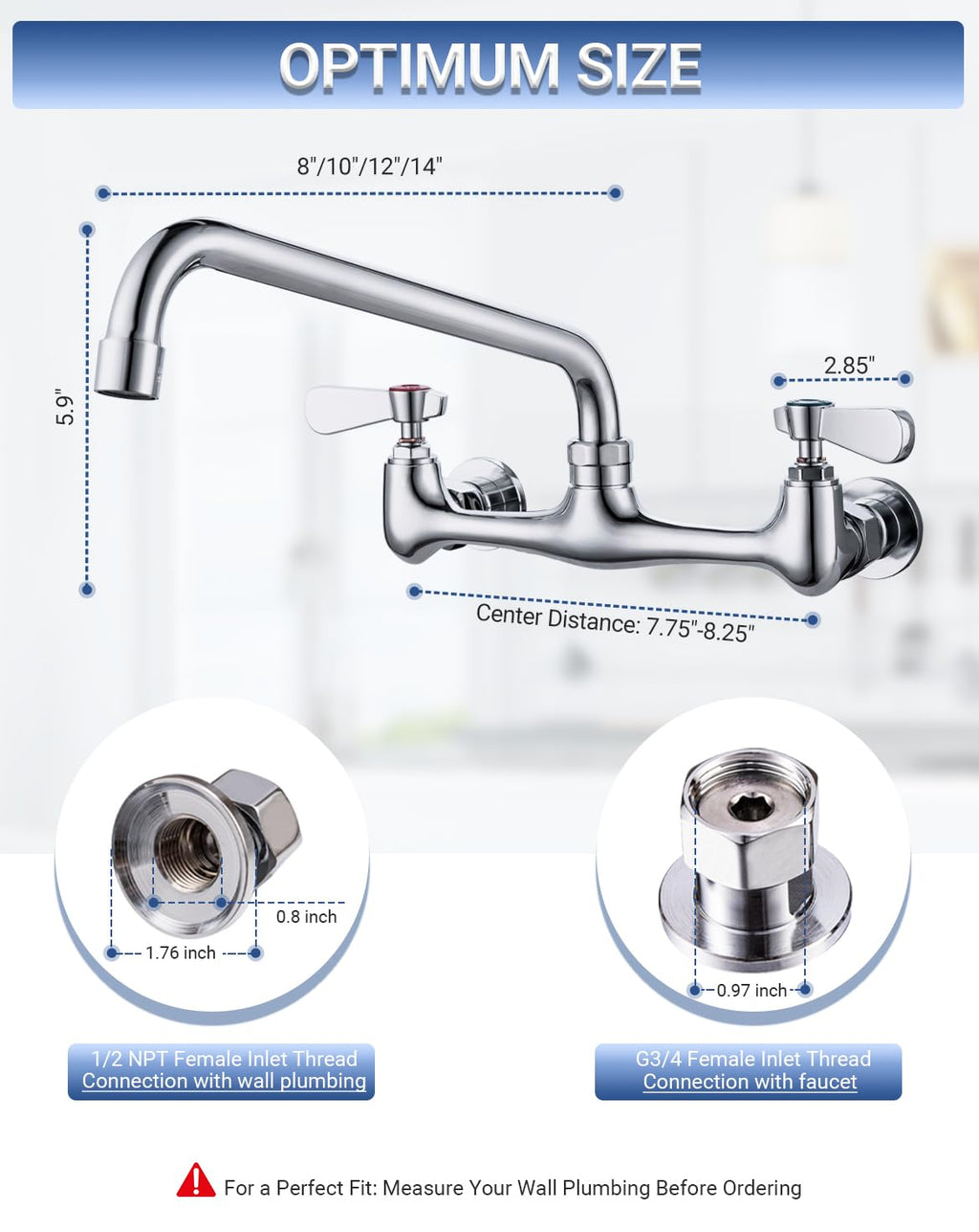 Easy to Install: With a focus on DIY installation, our kitchen faucet can be easily installed using the provided manual. 1/2 NPT male inlet installation kits, 8" adjustable center distance (available for hole distance:7.75"-8.25"), the installation can be adjusted to fit space requirements. High Quality Material Forging: The commercial sink faucet adopts a ceramic valve core, a heavy-duty brass construction with superior rust-resistant polished chrome finished. No rust, no cracks, no corrosion and never come off in the professional testing.