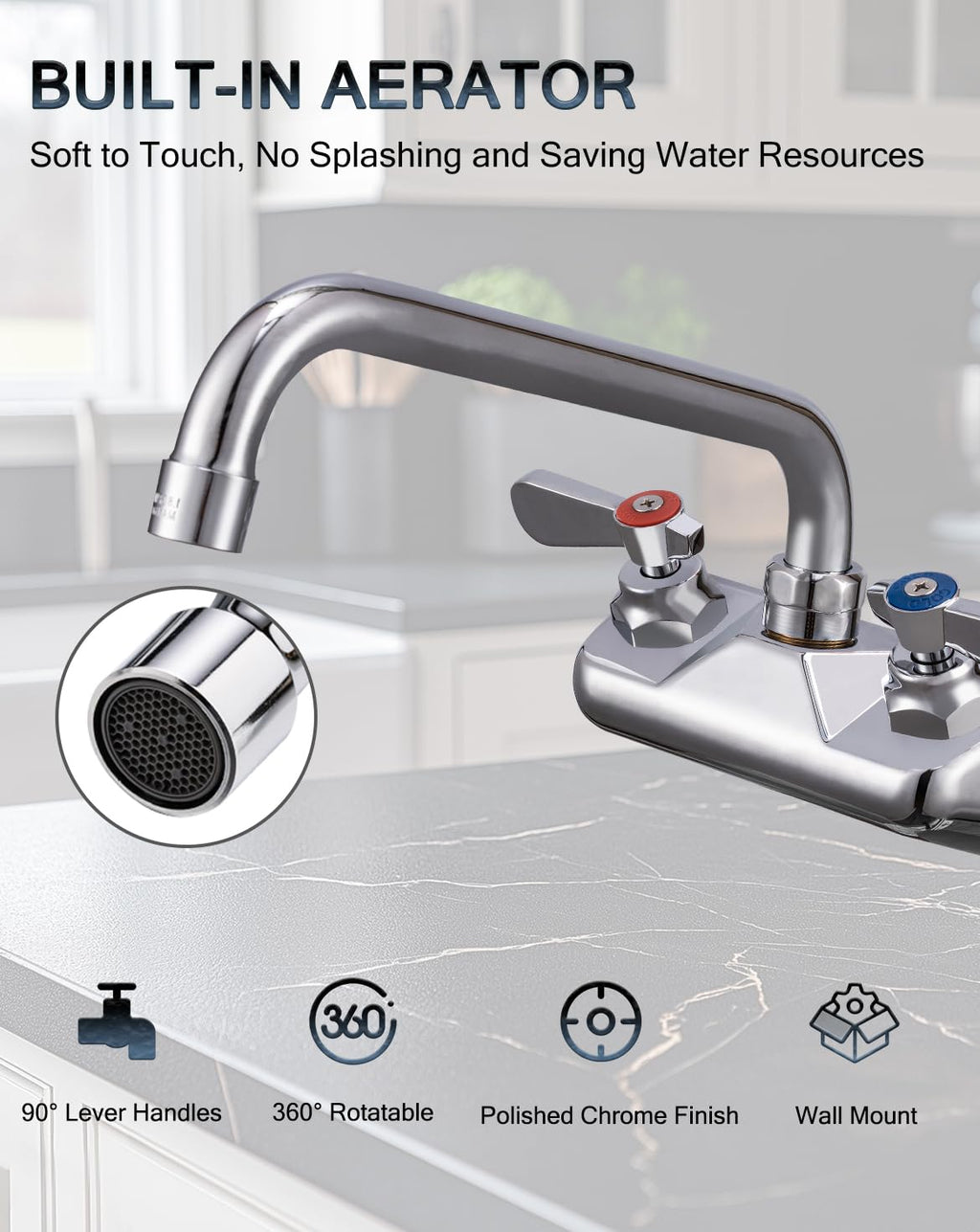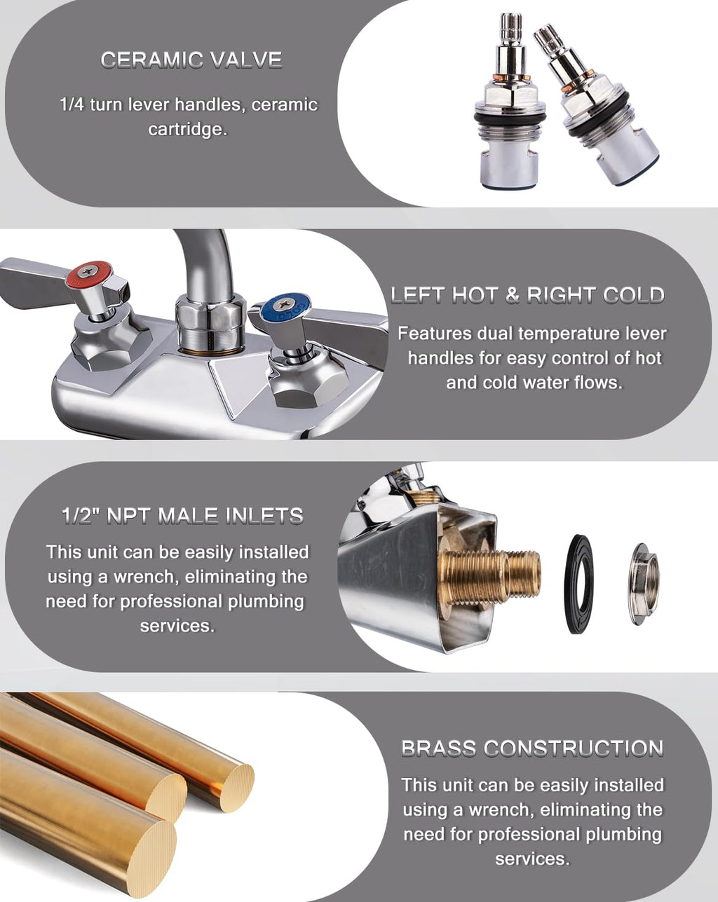 4 Inch Center Faucet: Designed with a standard 4-inch center for seamless installation, our commercial hand sink faucet features dual lever handles with hot and cold markings for easy temperature and flow control. This versatile design makes it a perfect fit for any commercial setting. Brass Construction: Our kitchen sink faucet is made of solid brass with a chrome plated surface, which has extraordinary durability and corrosion resistance. The bar sink faucet equipped with upgraded ceramic valves to ensure smooth and accurate water flow. This feature promises longevity, reliability, and reduced need for frequent replacements.