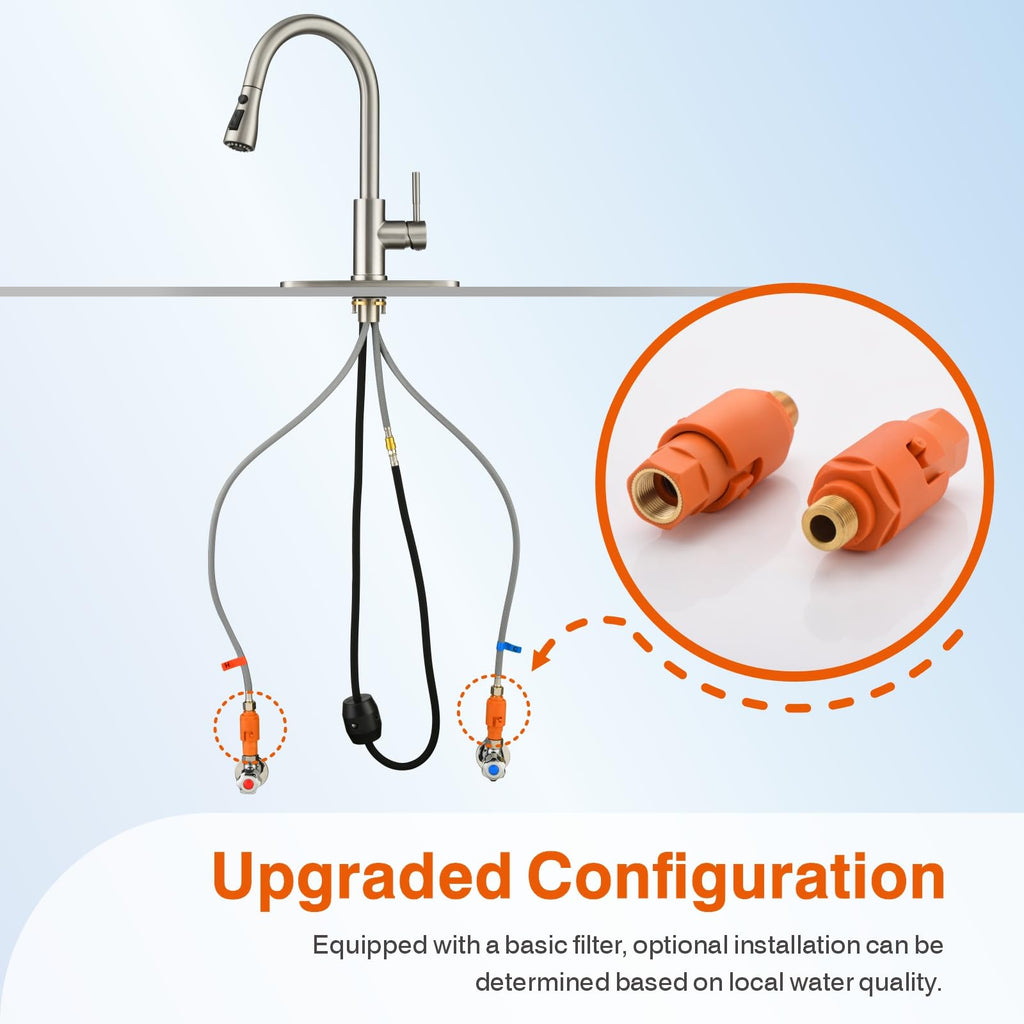 CONVENIENT EXPANDABILIT: With the ability to expand up to 24 inches, this pull down hose effortless reach and easy handling around the sink, enabling a wide range of movement to easily access every corner. NEW UPGRADED: Enhanced with upgraded configuration, this package now includes a basic filter and optional installation. Users can choose selectively based on their local water quality.