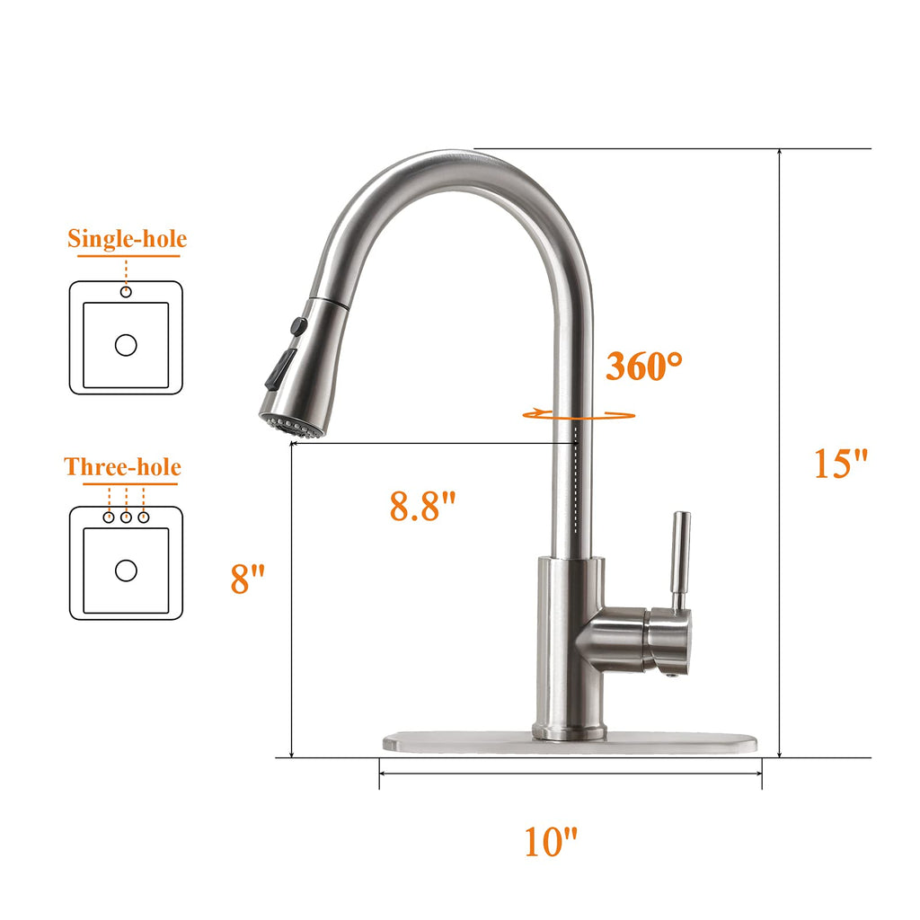 • DIMENSION: Overall Height: 15'' Spout Height: 8'' Spout Reach: 8.8'' High-arc spout swivels 360 Degrees for maximum sink access. 1 Or 3-hole 10" installation (Optional escutcheon included) Flow rate: 1.8 GPM