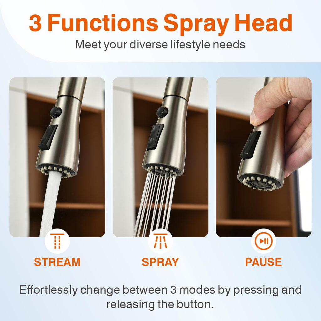 • MODERN AND STYLISH DESIGN: This kitchen faucet features a sleek design that will bring a fresh and elegant look to your kitchen, easily complementing most sinks.