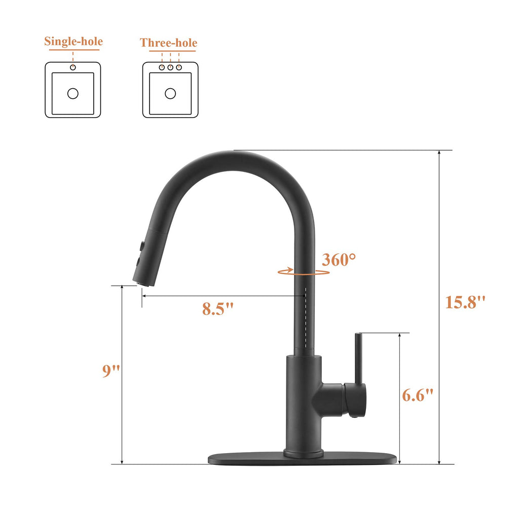 • DIMENSION: Overall Height: 15.8'' Spout Height: 9 '' Spout Reach: 8.5'' Handle Height: 6.6'' High-arc spout swivels 360 degrees for maximum sink access. 1 or 3-hole 10" installation (optional escutcheon included)
