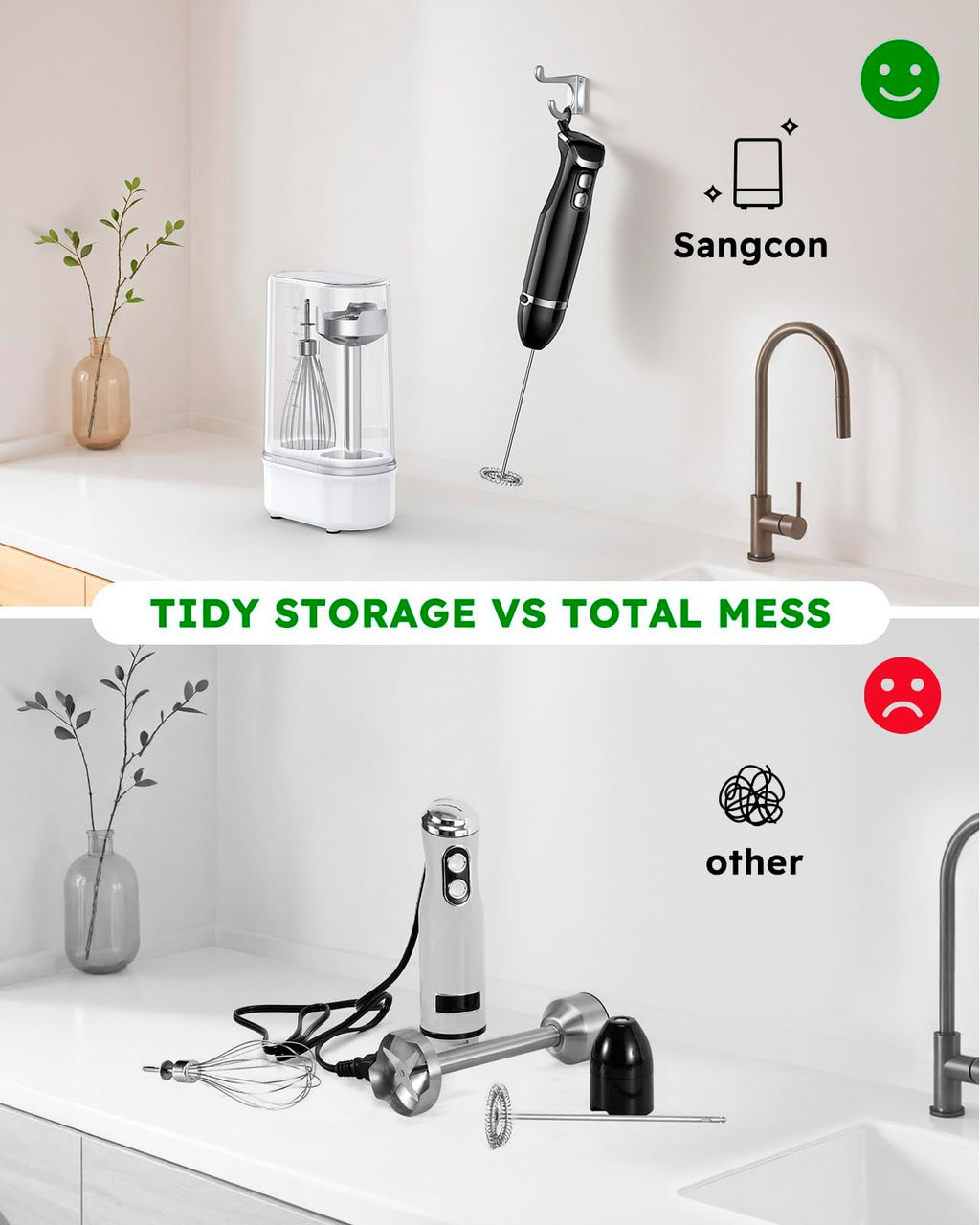 Powerful Motor For Superior Performance Sangcon Emulsion Blender Handheld Comes With A New 400-Watt Premium Motor That Delivers Plenty Of Power And Sharp Stainless Steel Blades For Easy Cooking. This Allows You To Effortlessly Create Smooth And Delicious Dishes. The Hand Blenders Immersion With High-Quality Motor Ensures A Quieter Kitchen Environment, Reducing The Noise Disturbance In Your Daily Life Easy To Clean And Store Sangcon Hand Mixer Electric Handheld Features A Snap-On Detachable Attachment Design, Making It Extremely Easy To Clean. The Attachments Are Etl Chemical-Free And Bpa-Free, And Are Dishwasher-Safe (Note: The Hand Blender Shaft Should Be Hand-Washed, And The Dishwasher Water Temperature Should Be Below 75°C). Additionally, Our Innovative Storage Design Includes A Storage Base And Measuring Cup To Efficiently Organize Attachments