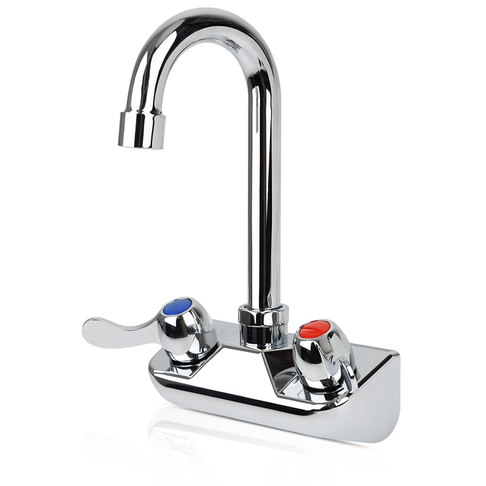 3-1/2" Gooseneck Swivel Spout Commercial Bar Sink Faucet: This commercial sink faucet is most designed for ceramic/acrylic/crystal stone or prep utility compartment sinks, loved by most customers. 4 Inch center wall mount kitchen sink faucet provides a clean and convenient water supply for daily life. Widely used for 1-2 commercial sinks of kitchens, Restaurants, homes, etc. Suitable for home improvement and replacement of old faucets. Wall Mount Faucet Detail:Material: Solid BrassFinish: polish chromeAdd on Spout: 3-1/2 inchesHandle Control: 2 handlesWater Flow: Max 2.2 GPMThread Type: 1/2 NPT male inletHole Center Distance: 4 inch center Water Supply: Hot and Cold water supply Installation Method: Wall Mount/Backsplash mount faucetProducts List:1 Faucet Body1 stainless swivel spout2 Lock Nuts2 Washers