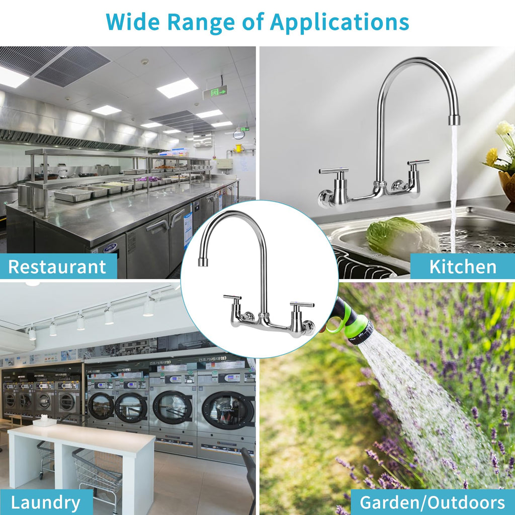 • Multi-functional scene application: Wall mounted faucet comes with removable aerators, you can connect a garden hose to the faucet with an adapter for washing your ground, car, and pet. Widely used for home kitchens, restaurant compartment sinks, and laundry rooms. ( the spout connector size is M251.25MM)