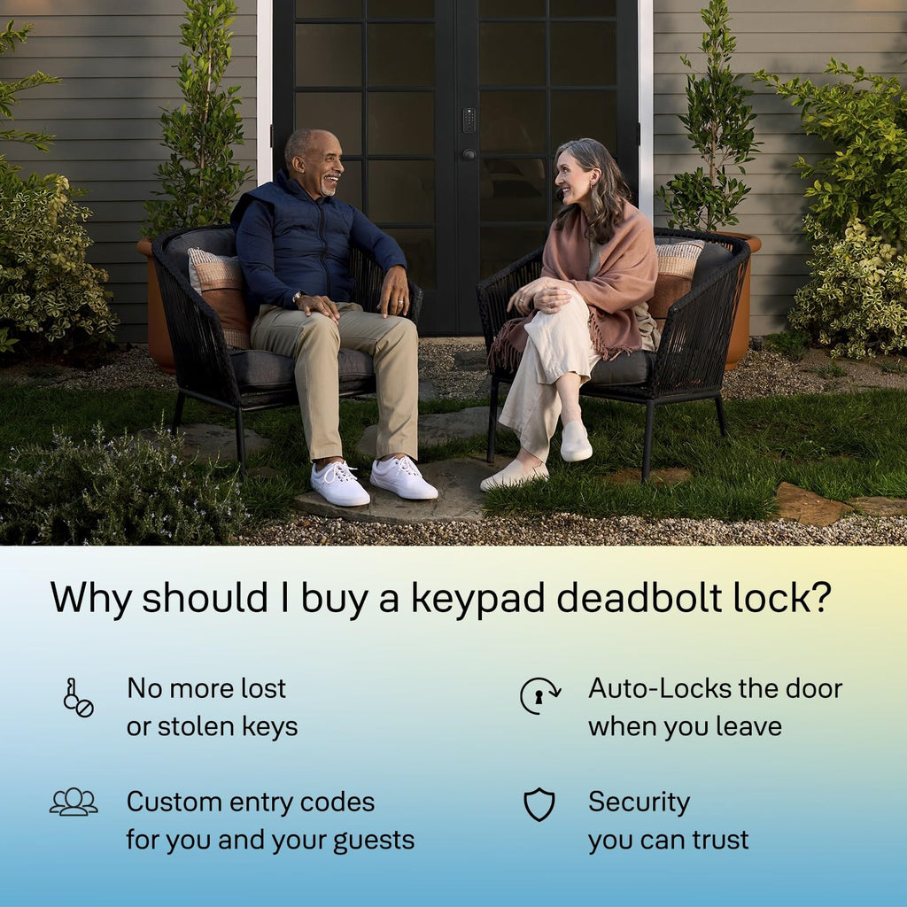 • Key-free entry for all: Create and store up to 20 entry codes from your lock so friends, family, housemates, and trusted individuals can have secure access when they need it, even if they forget their key.