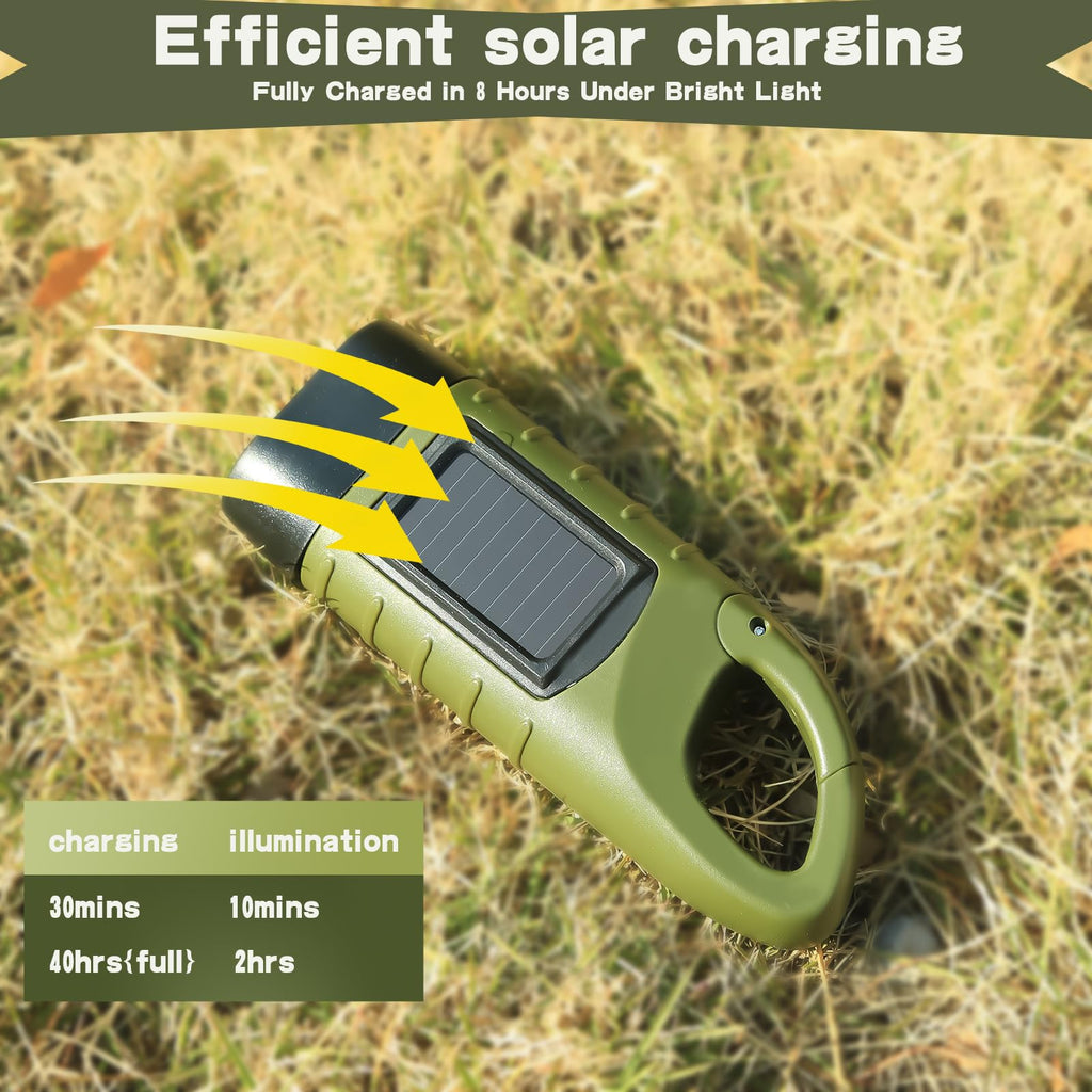 Efficient And Convenient Solar Charging:In Addition To Hand Crank Power, This Flashlight Is Equipped With A Solar Panel For Efficient Solar Charging, Maximizing Power Availability. Just Place It Under The Sun When Not In Use To Harness Solar Energy For Continuous Power. A 30-Minute Charge Provides Up To 10 Minutes Of Use, Ensuring You Always Have Light When You Need It. Compact & Portable:Designed For Convenience, This Flashlight A Lightweight Build With A Compact Size Of 124X45X32Mm And Weighs Only 85G, Making It Easy To Carry In Your Bag, Pocket, Or Any Small Space Without Taking Up Much Room.