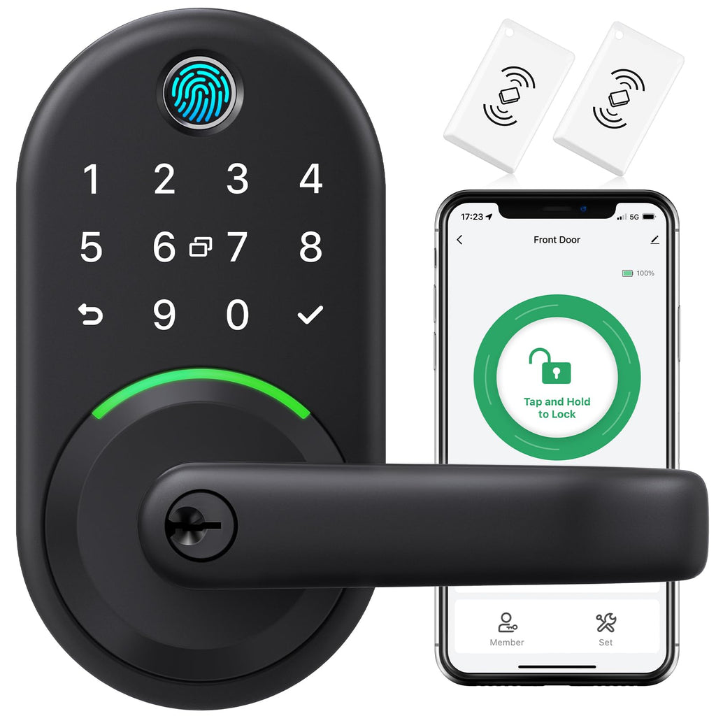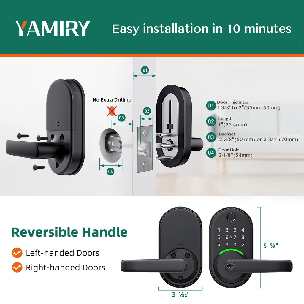 [Quick and Effortless Installation] Say goodbye to complicated installations and time-consuming setups. Our smart lock is designed for hassle-free installation, taking just 10 minutes to fit most standard American wooden front doors. Simply replace the existing handle, knob, or deadbolt using a screwdriver, without the need for any additional drilling. What's more, the reversible handle ensures compatibility with both left and right-handed doors. [Convenient Access Management via the App] Take complete control of access management with our intuitive mobile app. Grant permanent or temporary unlock access to your family members, remotely generate one-time passcodes for visitors, and effortlessly keep track of unlock records—all from the convenience of your smartphone. Stay connected and informed, even when you're away from home.