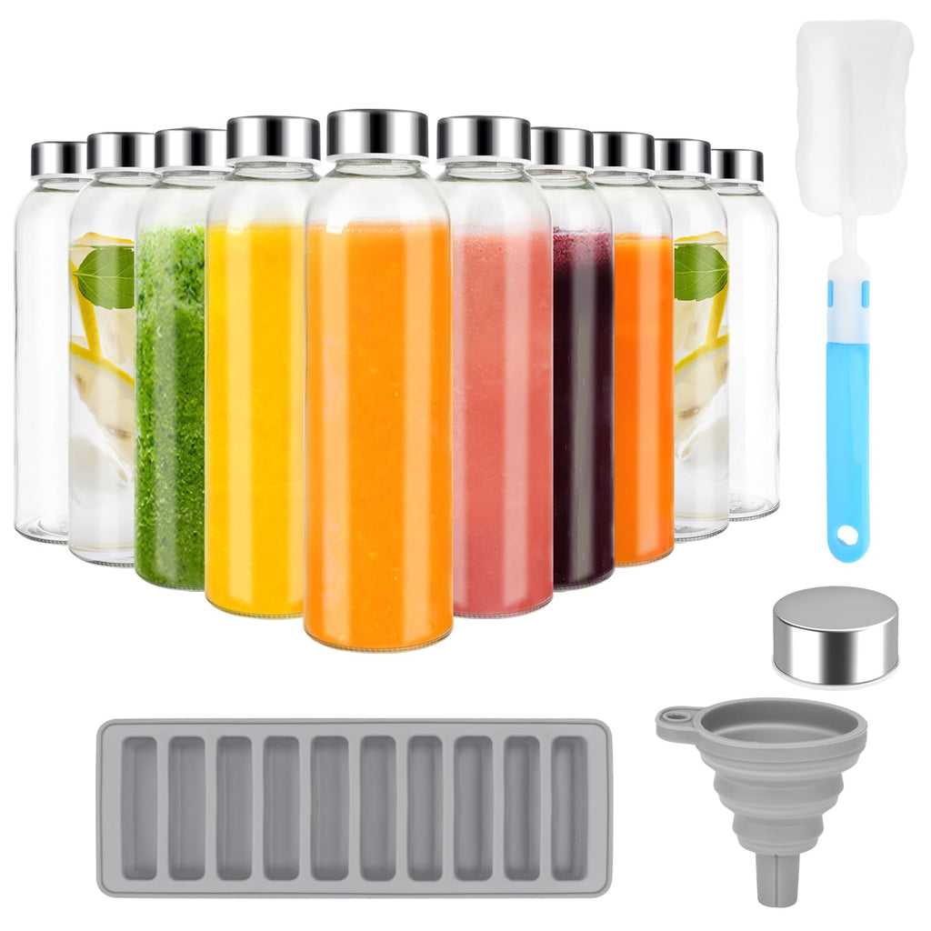 • SAVE MONEY WITH THIS VALUE PACK: Juicing Kit Bundle includes : 10 pack clear 18 oz Zukro glass juice bottles with airtight lids, a bottle cleaning brush for easy hand washing, a funnel helps you pour liquids inside the glass containers, an ice stick tray makes long and narrow ice cubes for adding ice easily, extra 1pc stainless steel airtight lids to ensure that the reusable glass bottles always remain sealed. Get our juicing bottles in bulk packs as gift for your whole family and friends